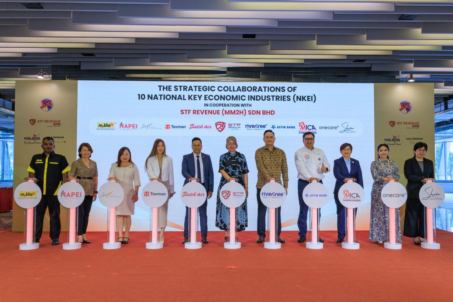 Pembukaan besar juga menyaksikan sokongan pelbagai pemimpin industri utama dalam pengumuman kerjasama strategik 10 industri ekonomi utama kebangsaan, yang diwakili oleh, dari kiri ke kanan, industri hotel, Mohamed Jafry Abdull Khathar, bendahari kebangsaan Malaysia Budget & Business HotelPersatuan (MYBHA);: Pendidikan, Dato ‘Lau Wau Ching, Presiden Persatuan Kebangsaan Institusi Pendidikan Swasta (NAPEI); Insurans, Amely Mah, rakan kongsi senior ACP Agency; Audit, Kee Chun Ooi, Pengurus Perakaunan Taxman; Perjalanan, Mohd Fauzi Rejab, Ketua Perniagaan KerajaanPembangunan udara batik; STF Group, Datuk Wira Joey Yan Lee Chin; Harta Tanah, Dato ‘Simon David Leong, Pengarah Urusan Kumpulan Rivertree Group; Perbankan, Datuk Wan Razy Abdullah Bin Wan Ali, Presiden dan Ketua Pegawai Eksekutif Kumpulan Affin Bank Berhad; Pelancongan, Dato ‘Dr Angie Ng,Presiden Persatuan Cina Inbound Malaysia (MICA); Tan Lat Yan, Pengarah Urusan OneCare Wellness; Undang -undang, Liew Sue Yin, rakan kongsi Shin Associates.
